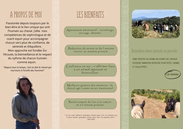 Accompagnement mieux-être par la sophrologie et les chevaux. Retrouver calme, confiance et équilibre au cœur de la nature.